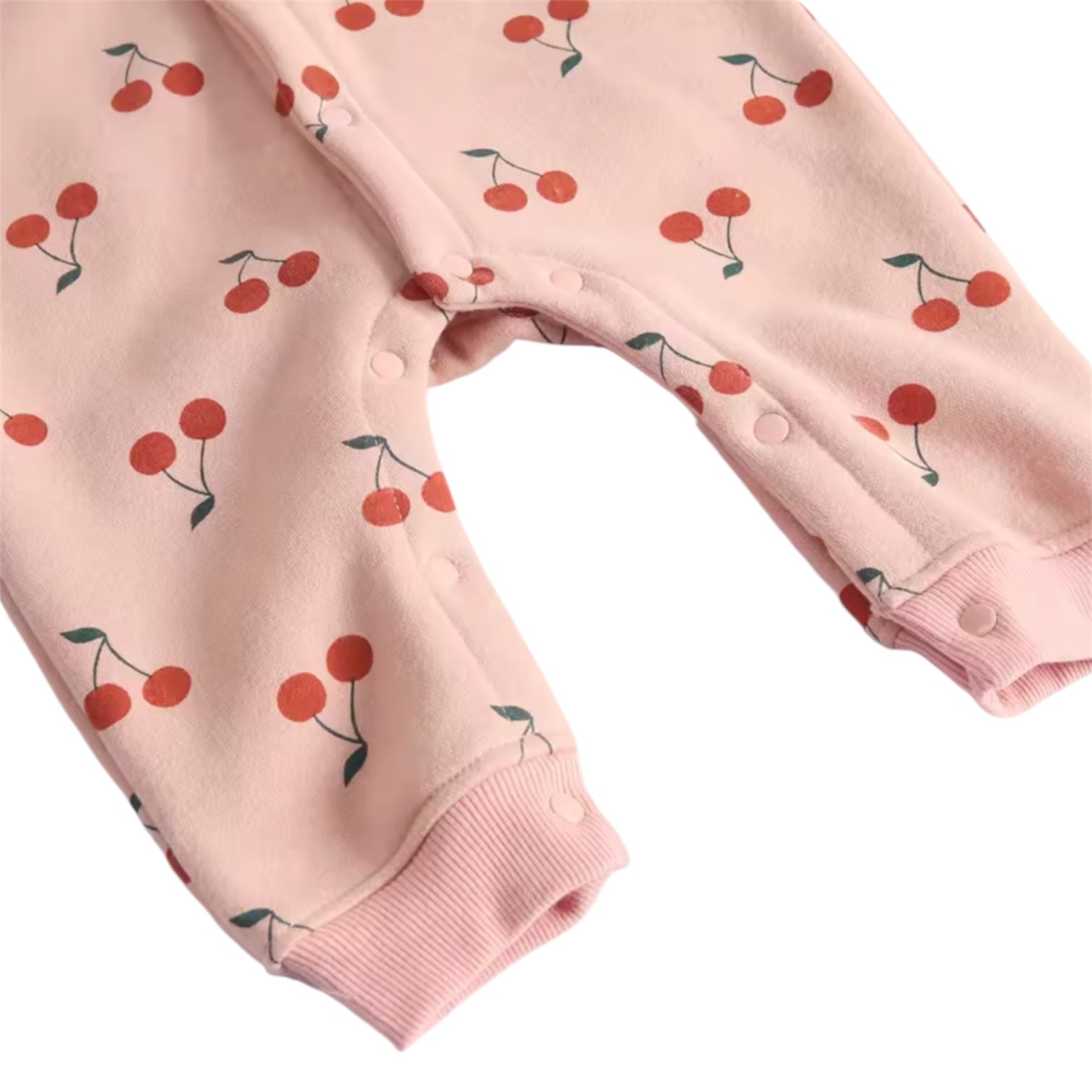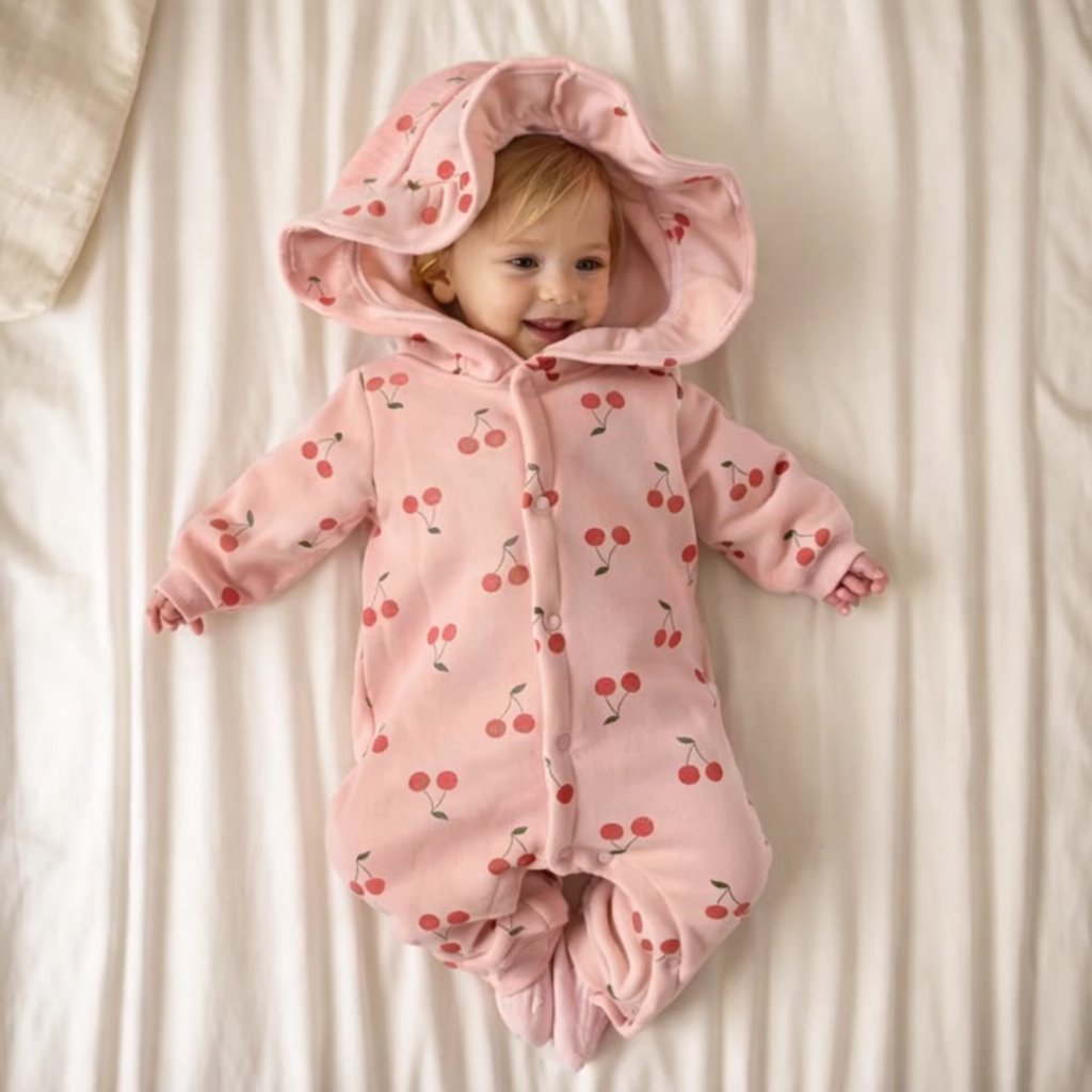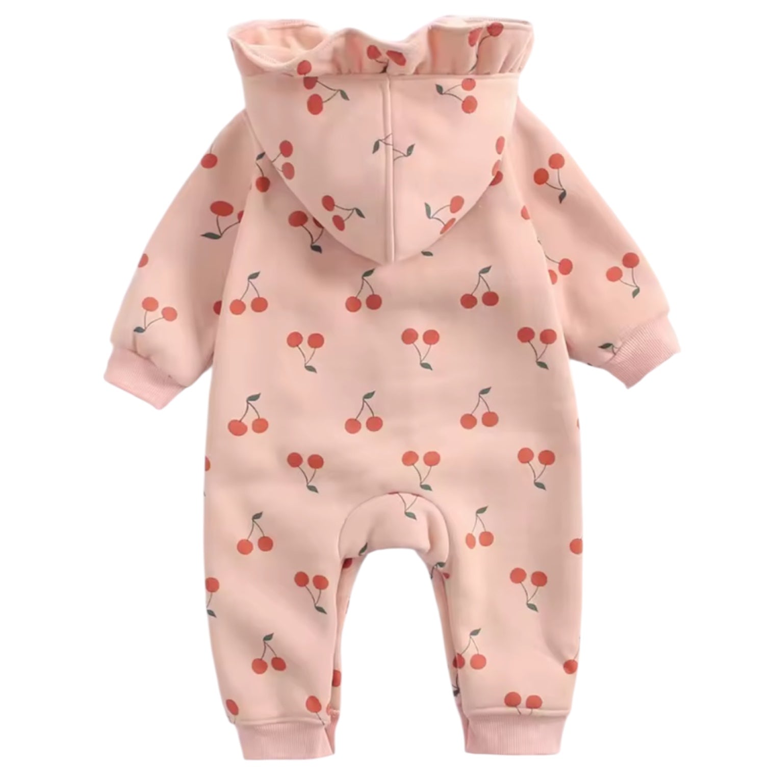 This adorable baby onesie is all about sweet details. Designed in soft pink with playful red hearts, it features layered ruffles at the back for an extra cute look. The crossed straps and delicate frills add a charming touch, while the matching bow headband completes the outfit perfectly.