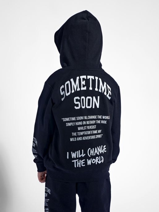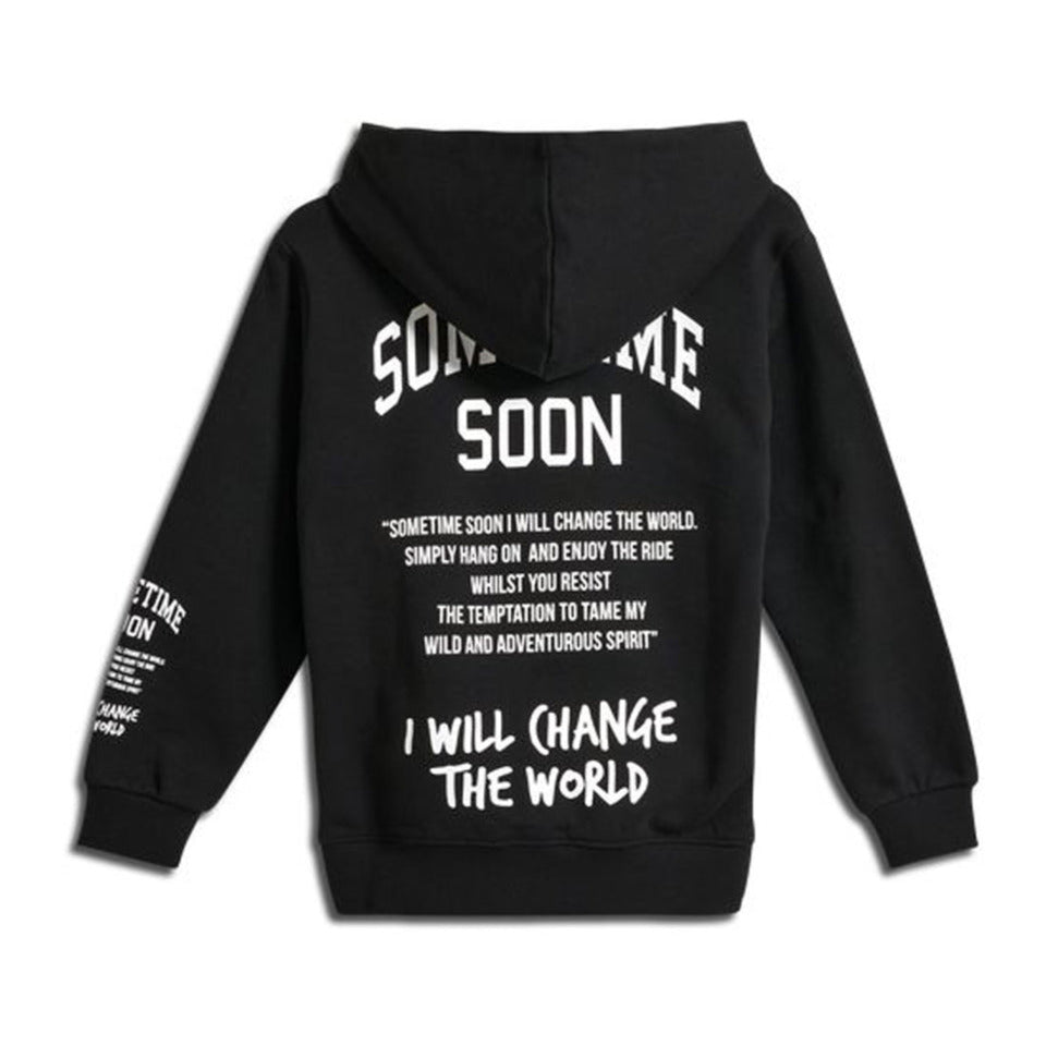 Constructed using an organic cotton blend fabric, the design of this hoodie features the classic “Sometime soon I will change the world” prints at the front, back and on the sleeve.